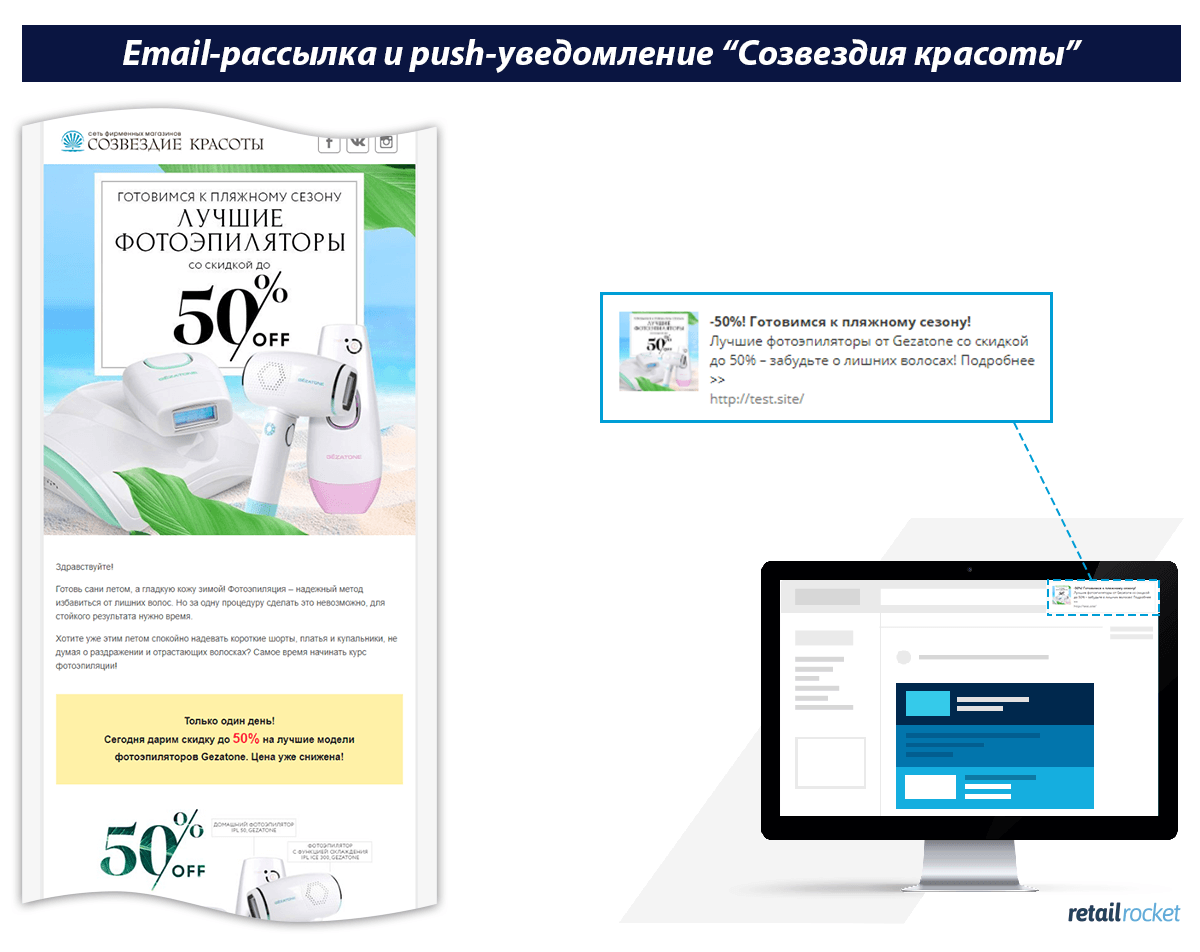 Интернет-магазин «Созвездие красоты» использует каскадные цепочки коммуникаций. Сначала выбранному сегменту аудитории отправляют email-рассылку, а спустя несколько дней те пользователи, которые не открыли письмо, получают push-уведомления с тем же содержанием.