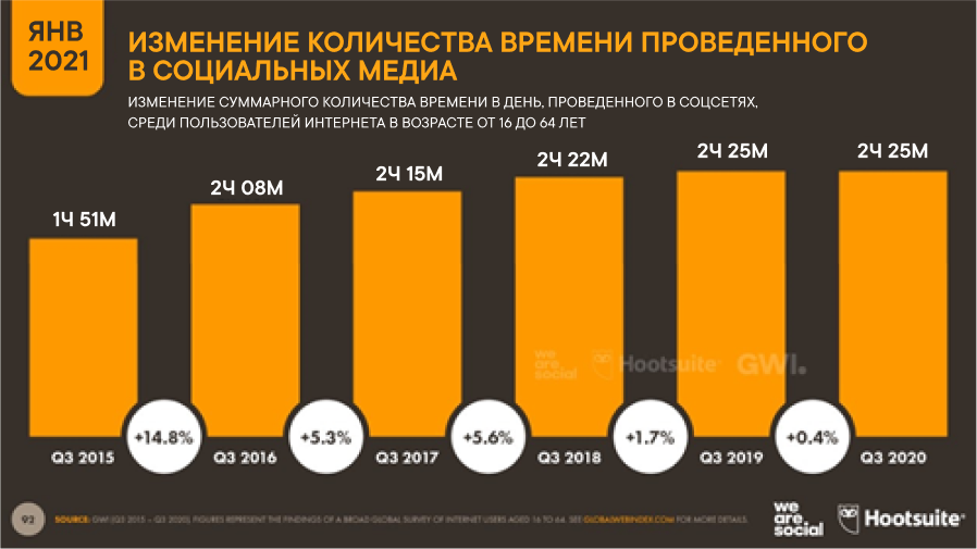 экранное время тоже продолжило расти, теперь пользователь тратит в среднем 2 часа 25 минут в день. Глобально это время сильно отличается по странам: в лидерах Филиппины и Колумбия с показателями в 4 часа 15 минут и 3 часа 45 минут соответственно, а закрывает рейтинг Япония, жители которой тратят всего 51 минуту (и это с учетом роста на 13% за год). Российские же показатели выше средних всего на три минуты.