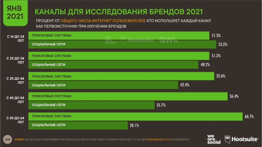 В этих условиях с притоком новых пользователей окреп и новый паттерн поискового поведения пользователей — 45% опрошенных во всем мире ищут необходимые товары и услуги сразу в социальных сетях. Для России эта цифра чуть меньше — 42%.