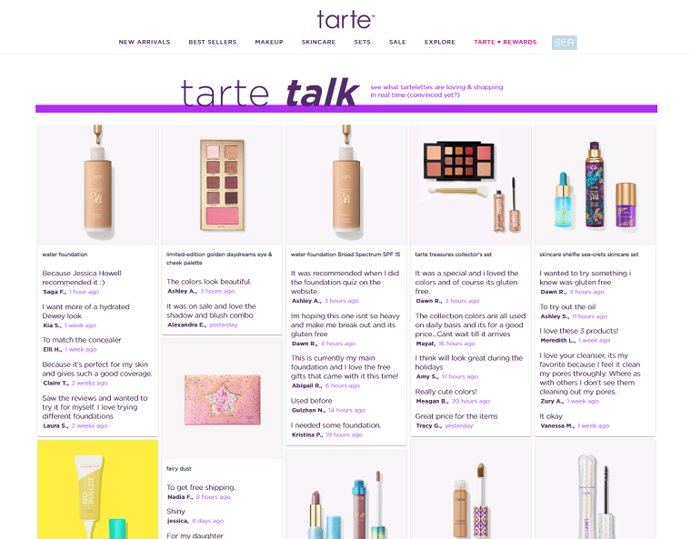 Косметическая марка Tarte начисляет участникам программы лояльности Tarte Rewards бонусы за отзывы о продуктах марки. Ритейлер запустил на сайте раздел «Tarte Talk» — ленту с фотографиями, обновляющуюся в момент публикации нового отзыва.