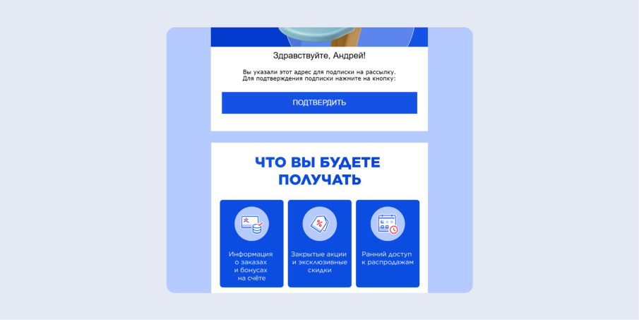 В рассылках бренды рассказывают о новинках, акциях и эксклюзивных предложениях. Но для начала пользователю нужно зарегистрироваться в вашем магазине и получить в своё распоряжение возможности личного кабинета, в том числе оформление подписки по имейлу и СМС. Личный кабинет — мощный инструмент укрепления отношений с покупателем и воспитания его лояльности, так что в ваших интересах стимулировать регистрацию пользователей.