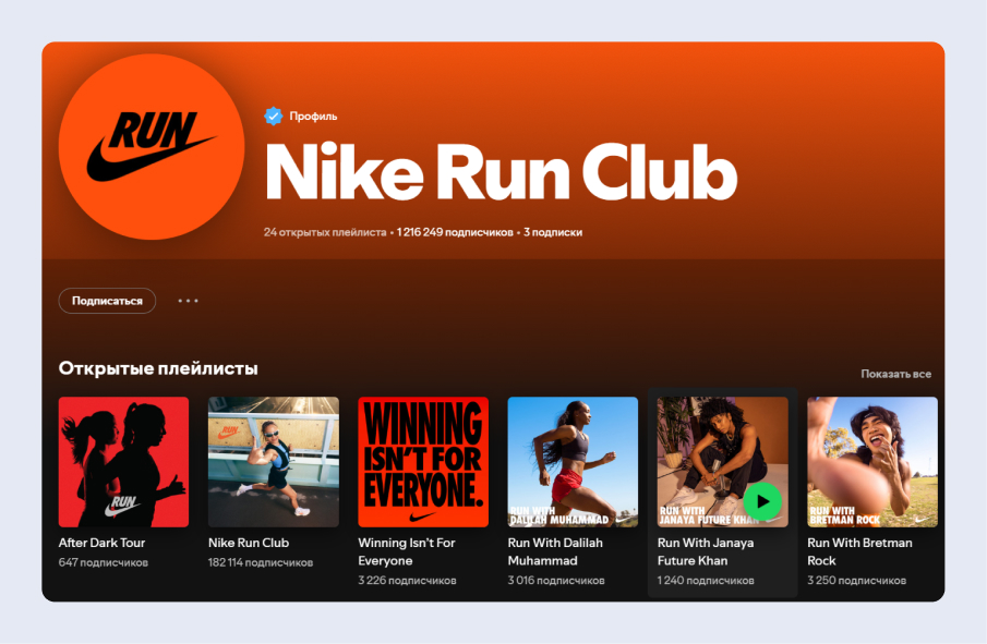 В занятиях спортом и туризмом важно держать темп и вообще на чём-то фокусироваться. И с тем, и с другим хорошо справляется музыка. Непонятно, почему, но брендированные плейлисты — очень редко встречающийся среди спортивно-туристических компаний способ поддержания имиджа и общения с коммьюнити. В различных подборках на эту тему попадается только кейс бренда Nike. У бренда есть собственный трекер бега Nike Run Club, в поддержку которому владельцы трекера завели аккаунт на Spotify. Сейчас на него подписаны более 1,2 миллиона человек, где у них висит 24 плейлиста, и одноимённый — самый популярный (более 181 тысяча подписчиков).