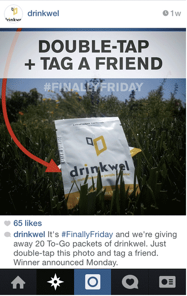 Вот пример еженедельного конкурса для «жаждущих победы» от Drinkwel. Участникам нужно лайкнуть фото (обычно с изображением продукции компании) и подписаться на аккаунт, чтобы следить за дальнейшими обновлениями. В конкурсе используется собственный хэштег бренда —#finallyfriday.