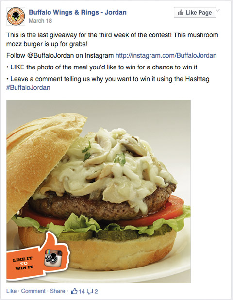 Итак, конкурс придуман, все готово к его началу. Сообщите о конкурсе на сайте компании и/или напишите о нём статью на блоге. Обязательно добавьте ссылки на конкурс, по которым сразу можно перейти в Instagram. Займитесь кросс-продвижением конкурса на других социальных платформах. Важно привлекать аудиторию, которой интересен ваш бренд, с других социальных платформ — Facebook, Twitter и Pinterest. Информацию о конкурсе подавайте таким образом, чтобы мотивировать подписчиков в Instagram взаимодействовать с вами и на других платформах. Именно так поступила компания Buffalo Wings & Rings, продвигавшая на Facebook собственный конкурс в Instagram.