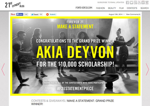 Forever 21 сообщил имя победителя и выложил снятое им видео на своем блоге