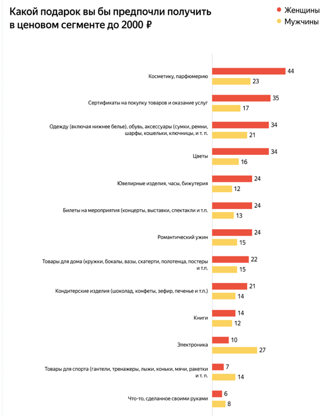 На подарки к Международному женскому дню от 10 до 30 тысяч рублей планирует 21% опрошенных, а к 23 Февраля - 13%. Купить подарки дороже 50 тысяч рублей готов 1% участников опроса. Среди подарков до 2 тысяч рублей женщины хотели бы получить косметику и парфюмерию, а мужчины - электронику.