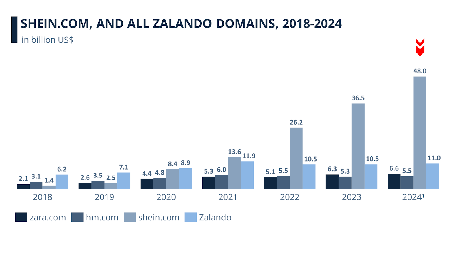Впрочем, куда она подевалась, стало понятно довольно быстро. Видите высокий столбик, отмеченный стрелкой на рисунке ниже? Это Shein — китайский ритейлер, ворвавшийся в индустрию с ноги.