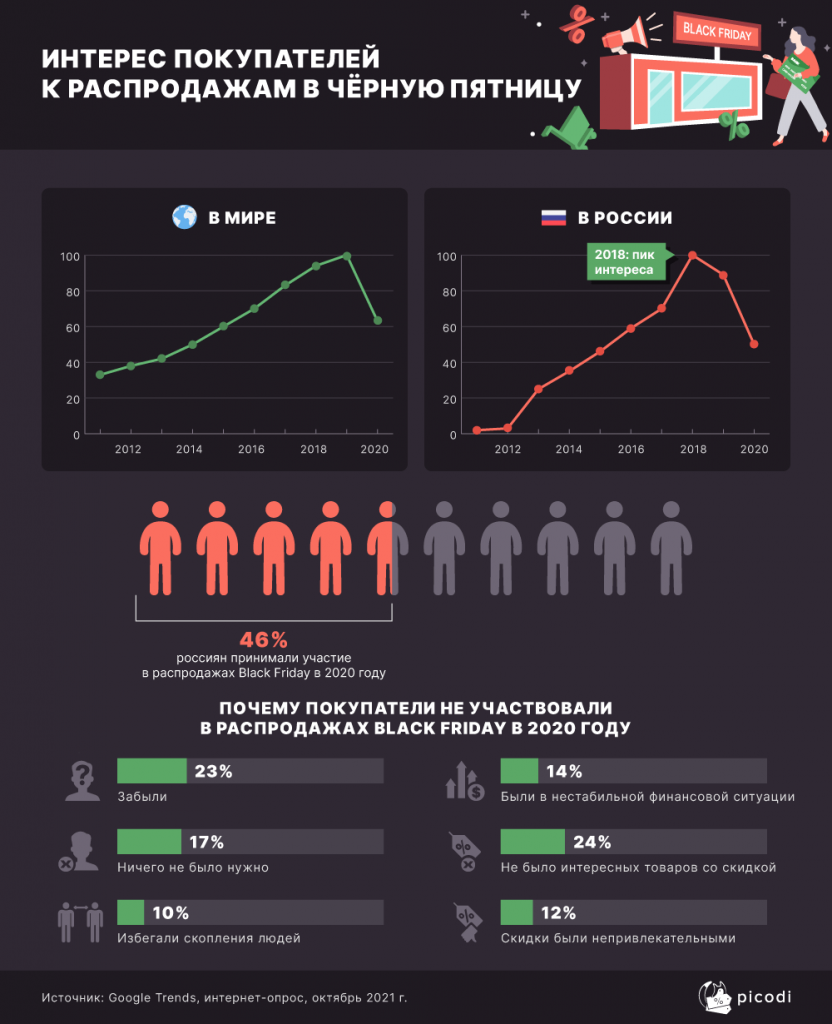 В 2020 году Чёрная пятница впервые была проведена в условиях пандемии. Данные Google Trends показывают, что количество запросов, связанных с распродажами Black Friday, в прошлом году уменьшилось на 37%. В России пик интереса к Чёрной пятнице пришёлся на 2018 год, а снижение интереса было зафиксировано уже в 2019 году. Аналитики Picodi.com проверили, как с годами менялся интерес к распродажам Black Friday и опросили интернет-пользователей, чтобы узнать, что покупатели думают о Чёрной пятнице и как много людей планируют купить что-нибудь 26 ноября 2021 г.