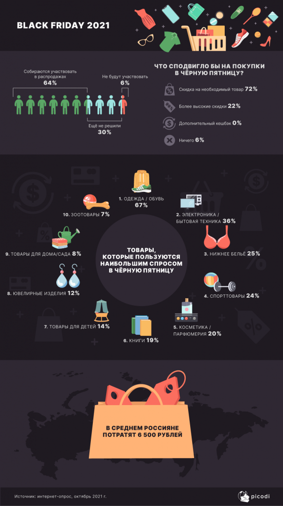 Мы узнали, какие товары интересуют людей, решивших принять участие в распродажах. На первом месте находятся одежда и обувь (67%), на втором – электроника и бытовая техника (36%), а на третьей позиции – нижнее бельё (25%). Среднестатистический покупатель готов потратить на распродаже Black Friday 6 500 рублей, а в 2020 году эта сумма составляла 9 100 ₽.