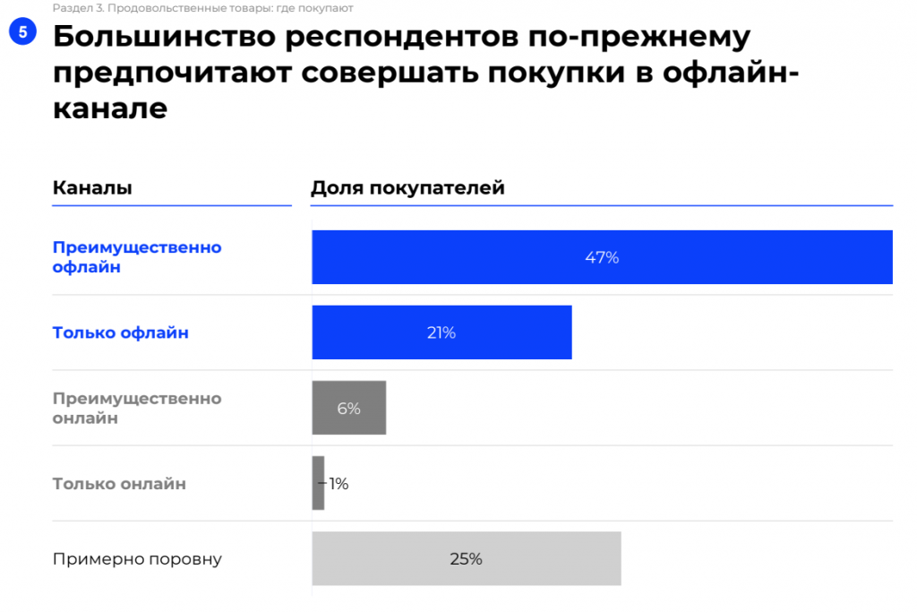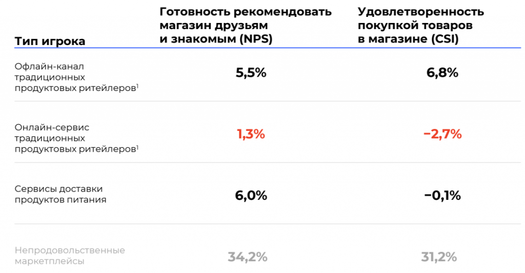 Интересно, что потребители менее удовлетворены покупкой продуктов питания в онлайн-канале традиционных ритейлеров, чем у крупных онлайн-игроков.