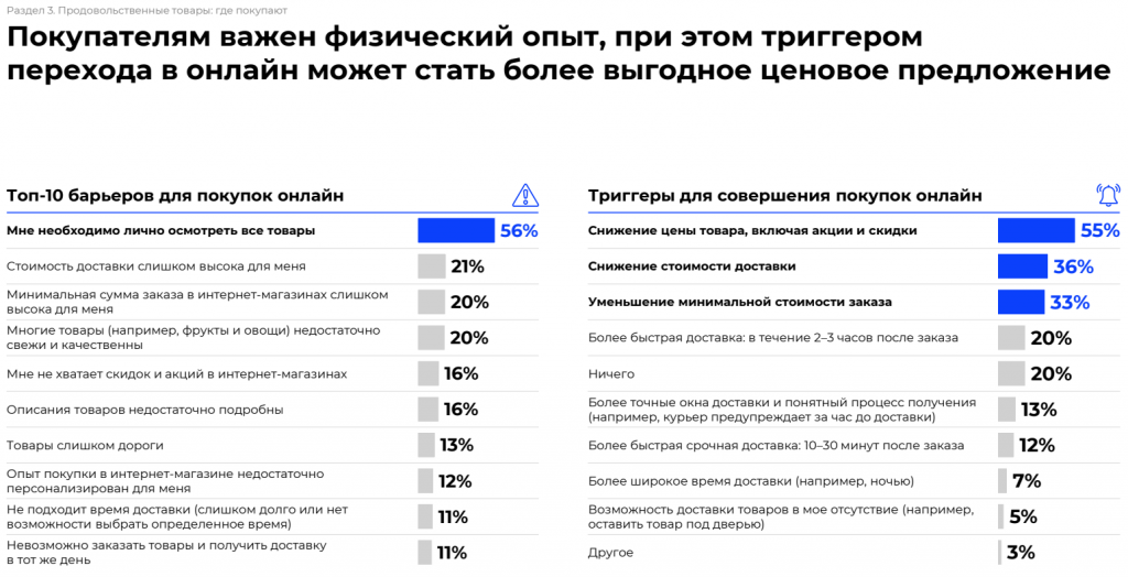 Основным препятствием для покупки онлайн называют отсутствие возможности лично осмотреть и выбрать товар (56%). 21% полагает, что стоимость доставки продуктов слишком велика. Также недовольны люди минимальными суммами доставки и качеством товара.