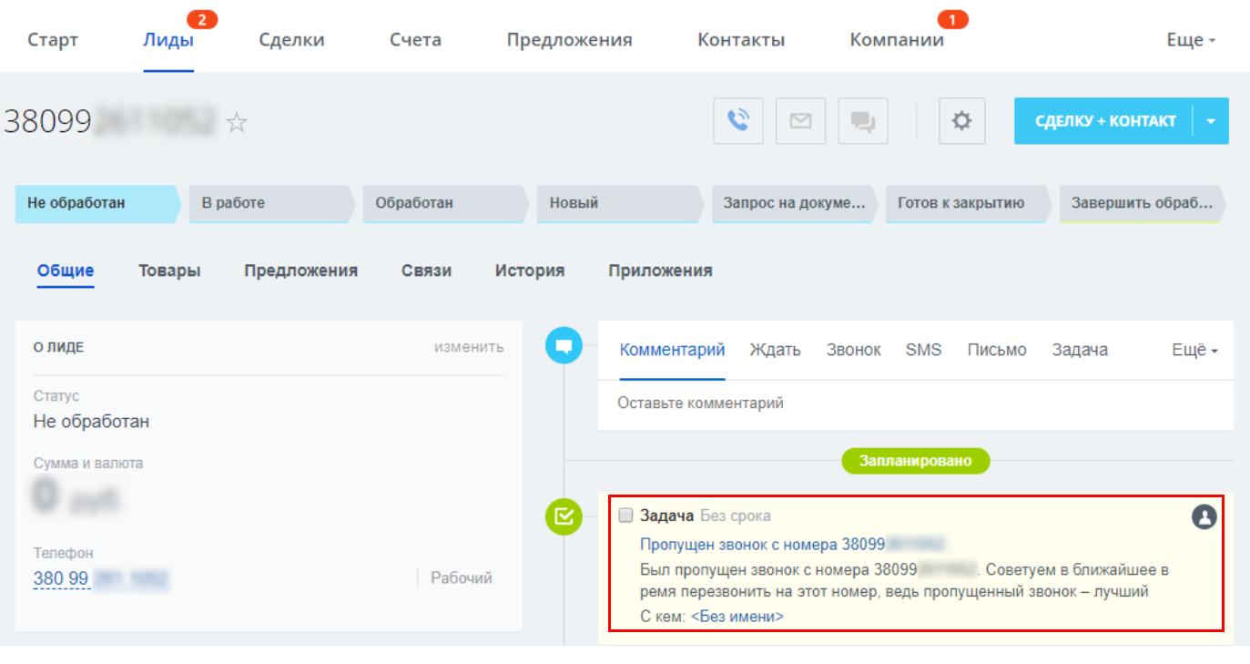 Пример задачи по обработке пропущенного звонка в интерфейсе Битрикс24.CRM