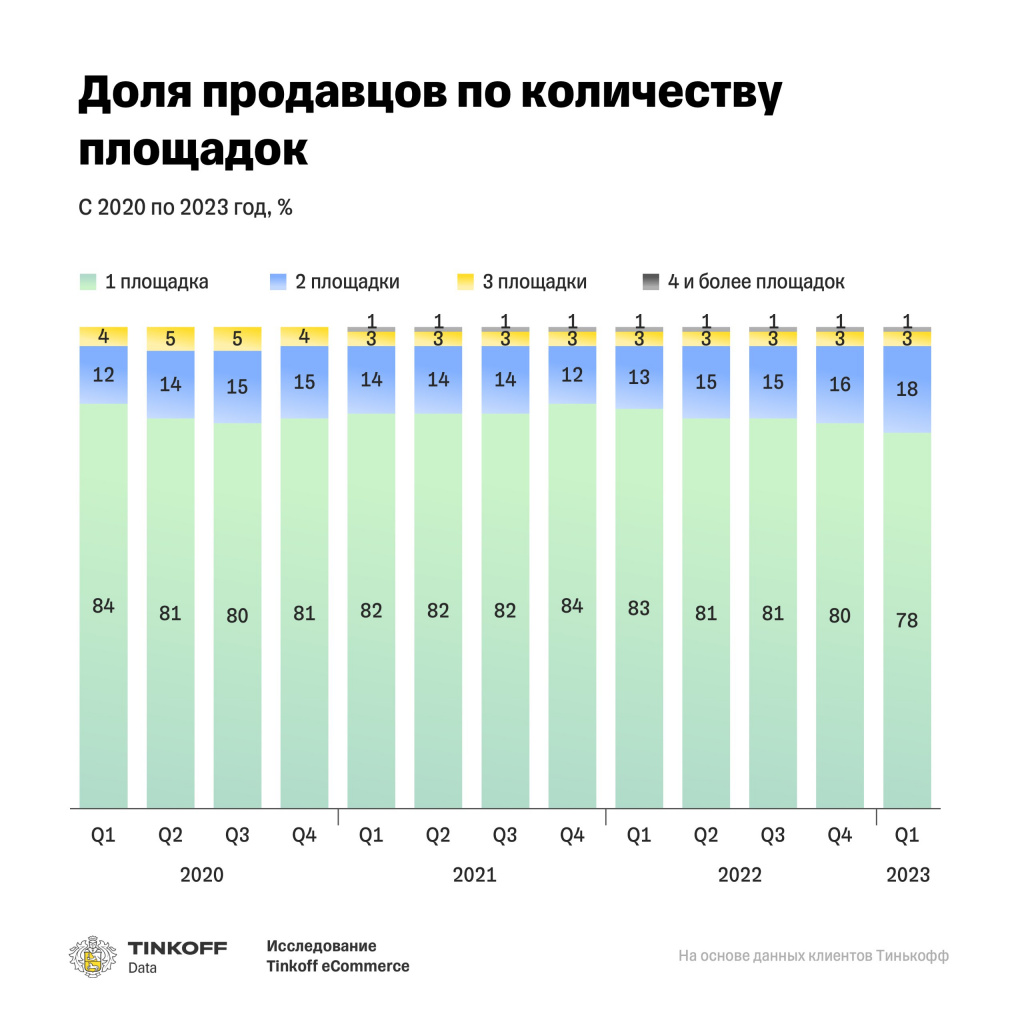 За год доля продавцов, работающих одновременно хотя бы с двумя онлайн-площадками, существенно выросла. Хотя большинство продавцов предпочитают работать на одной площадке, селлеры с течением времени начинают подключать дополнительные маркетплейсы, свидетельствуют данные отчёта Tinkoff eCommerce.