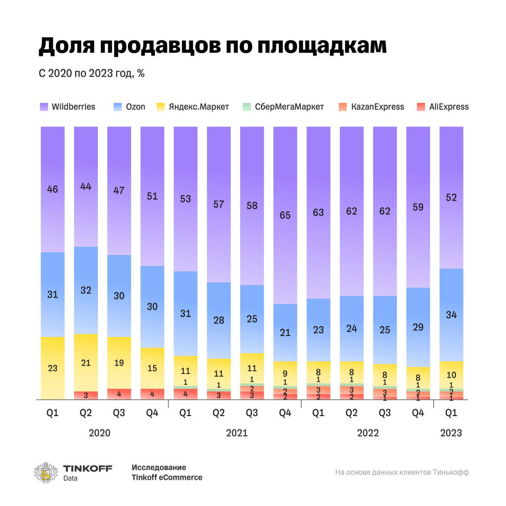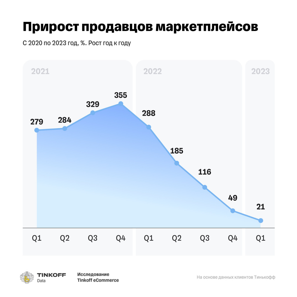 По данным Тинькофф eCommerce, с первого квартала 2022 по первый квартал 2023 года прирост активных продавцов на маркетплейсах снизился: их количество выросло всего на 21%. Для сравнения: в первом квартале 2022 года рост составлял +288%.