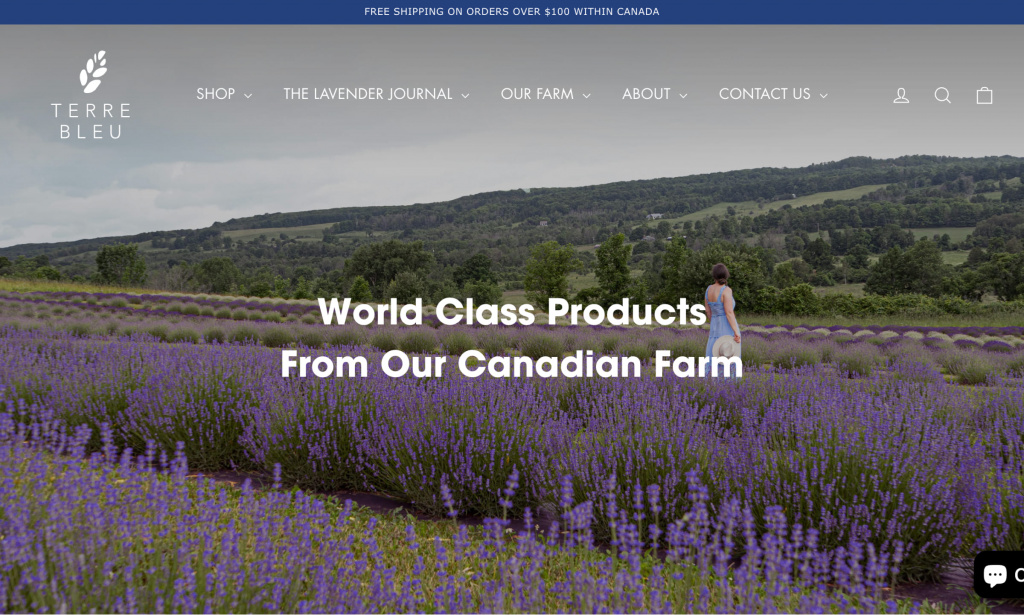 Terre Bleu — лавандовая ферма из Онтарио, Канада. Владельцы Иэн и Изабель Бэрд используют Shopify для продажи косметики, продуктов питания и товаров для дома с добавлением лаванды. Витрина оформлена в фирменной эстетике, которая передает атмосферу Прованса.