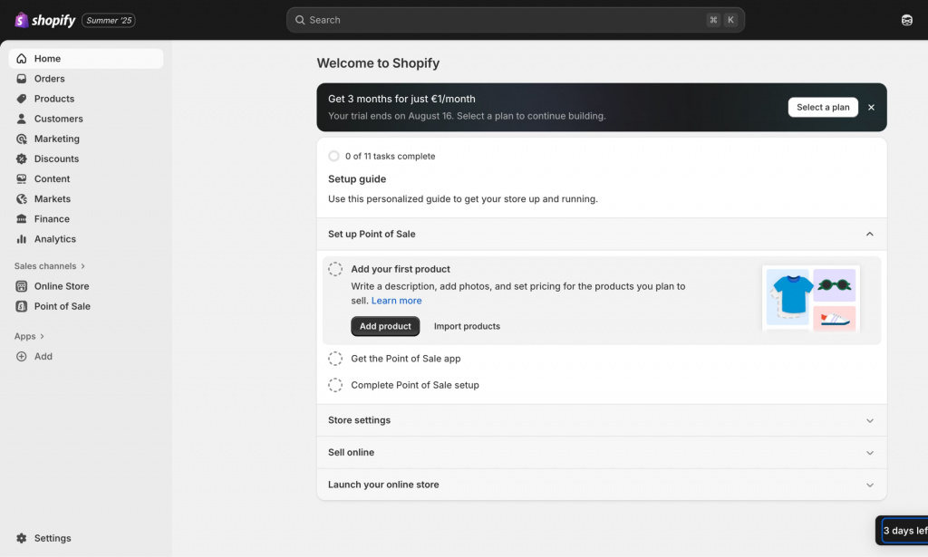 Используйте пробный период. Shopify предоставляет 3 дня бесплатного доступа ко всем функциям. За это время можно изучить механику платформы. После завершения пробного периода первый месяц работы на любом тарифном плане стоит $1.