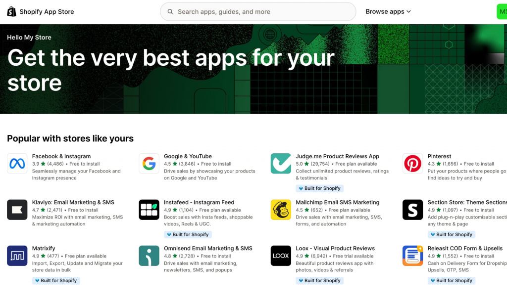 Shopify App Store. Каталог из 8000+ приложений для расширения возможностей магазина: от SEO-оптимизации до интеграции с ERP-системами.