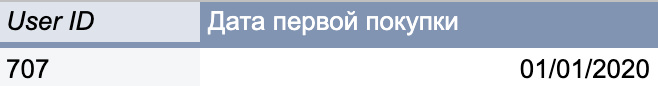 Для этого нужно всего лишь построить сводную таблицу со следующими параметрами на примере Google Sheets. То есть мы просто к каждому User ID подтягиваем дату первой покупки.