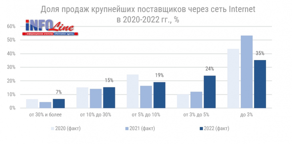 По данным INFOLine, сотрудничество с интернет-магазинами и маркетплейсами помогает производственным компаниям увеличивать долю онлайн-продаж строительных и отделочных материалов. В то же время, число предприятий, где доля электронной коммерции не превышает 10%, сократилось до 78%. Количество производителей, использующих онлайн-канал на 30% и более, выросло на 2,3 процентных пункта и составило 6,7%.