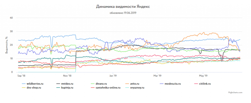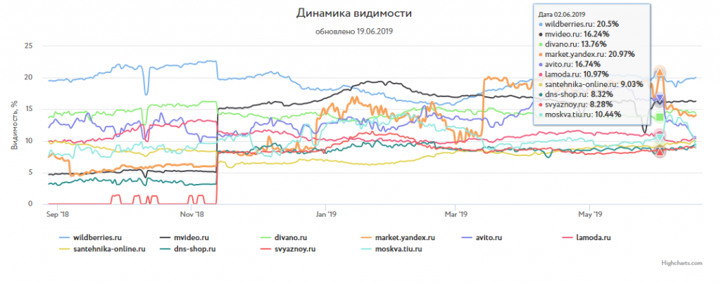 Из интересных тенденций стоит отметить рост позиций "Яндекс.Маркета", который близок к тому, чтобы потеснить Wildberries с первой позиции. Мало того, в начале июня он уже побывал на первом месте, правда потом уступил не только Wb и "М.Видео", но даже порталу divano.ru.
