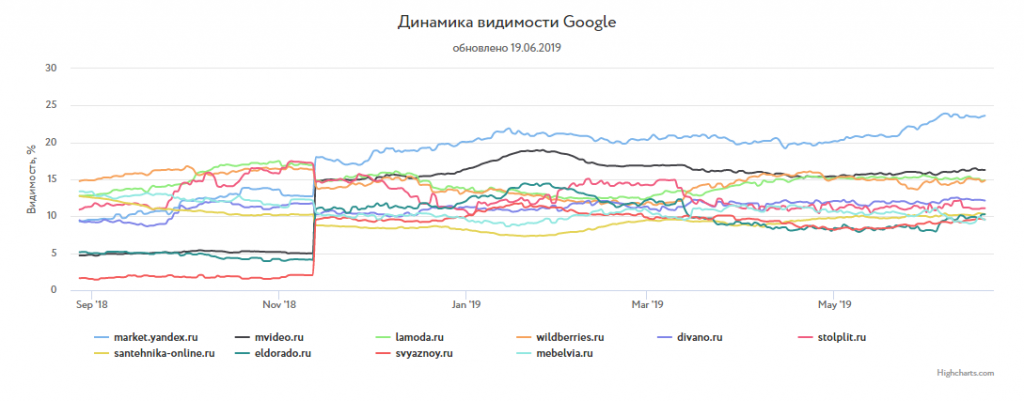Интересно, что в лидерах десктопного поиска "Яндекса" маркетплейс "Яндекс.Маркет" даже не попадает в десятку, зато в динамике видимости Google лидирует с огромным отрывом.