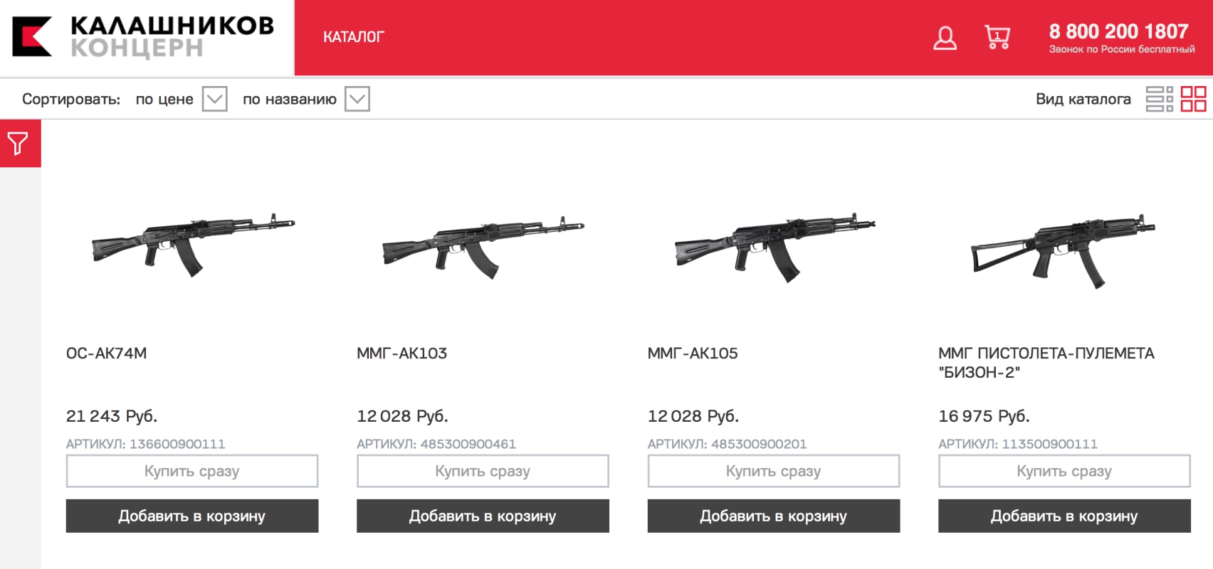 На сайте представлено более 40 товарных позиций в трех категориях: оружие, одежда и сувениры. Клиентам онлайн-площадки предлагается продукция двух брендов: «Калашников» – боевое оружие, «Байкал» – охотничье и гражданское оружие. Спортивное оружие под брендом «Ижмаш» в интернет-магазине пока не представлено.