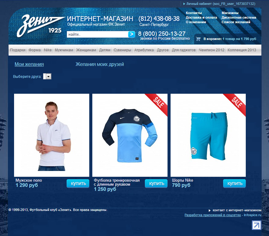 Главными рабочими задачами для команды стали создание и реализация на основе API Facebook и «ВКонтакте» механизмов торговли в соцсетях, которые давали бы возможность аудитории интереснее, быстрее и чаще совершать покупки там, где им удобнее всего. По словам Константина, все осложнялось тем, что на Западе переход интернет-магазинов в социальные сети — дело давно привычное и довольно успешное. В России же другая скорость внедрения и принятия инноваций. Поэтому, помимо реализации технических моментов агентству нужно было четко понимать, что будет максимально эффективным для российских пользователей и какая последовательность действий аудитории в «социальном» интернет-магазине приведет к росту продаж у заказчика. В ходе проекта разработчики «Инфоспайс» соединили функционал «1С-Битрикс: Управление сайтом» и API Facebook и «ВКонтакте», получив в результате ряд интереснейших решений и инструментов, нацеленных на рост продаж в соцсетях. А использование технологии «SocialBitrix» позволило команде проекта за несколько недель создать отдельные версии интернет-магазинов для «ВКонтакте» и Facebook на основе уже действующего интернет-магазина. «Мы взяли текущую версию интернет-магазина ФК «Зенит», чтобы адаптировать ее под форматы приложений социальных сетей и интегрировать через API cсоциальными сетями», — описывает ход проекта Константин.Самые интересные решения проекта