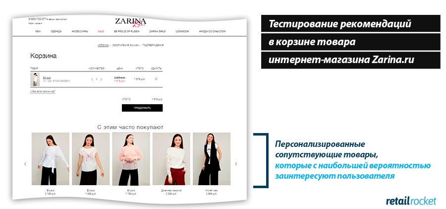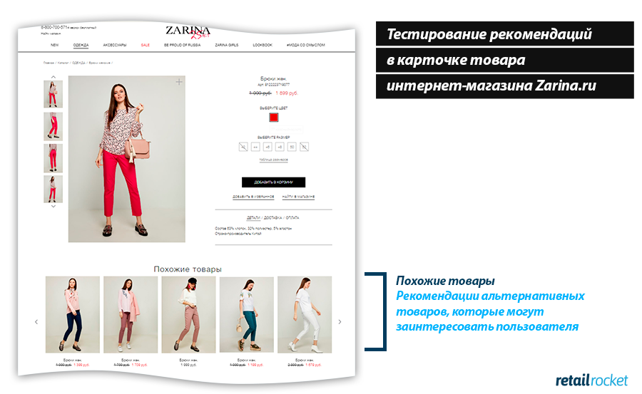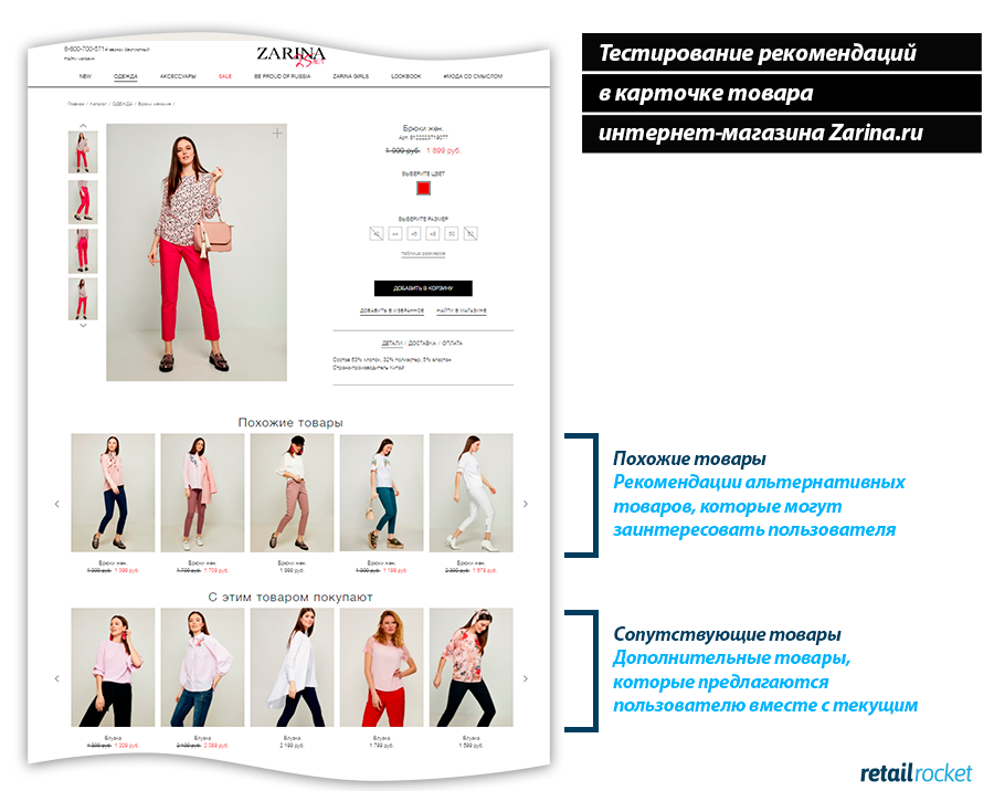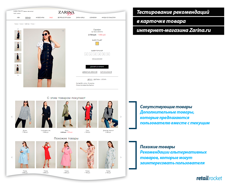 В карточке товара на сайте Zarina.ru было протестировано несколько алгоритмов и вариаций расположения блоков товарных рекомендаций, чтобы определить, какой из них имеет большую конверсию и приносит большую выручку.