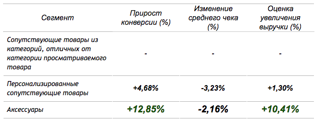 Первому сегменту показывались сопутствующие товары из категорий, отличных от категории просматриваемого товара, потому что этот блок оказался наиболее эффективным по результатам предыдущего теста.