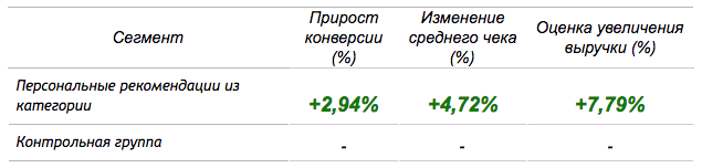 Второй сегмент был контрольной группой, которой рекомендации не показывались.