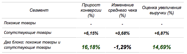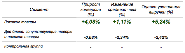 Первый сегмент был контрольной группой. Пользователям показывался блок рекомендаций похожих товаров, потому что он оказался наиболее эффективным по результатам предыдущего теста.
