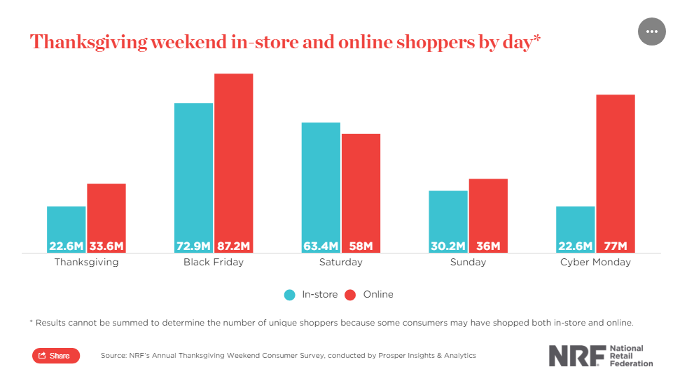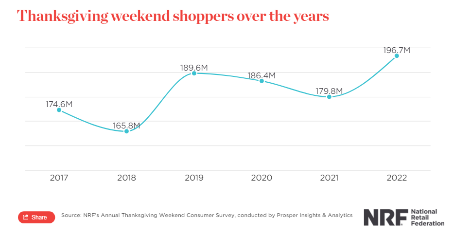 Согласно данным ежегодного исследования, опубликованного Национальной федерацией розничной торговли и компанией Prosper Insights & Analytics, в течение пятидневного праздничного периода от Дня благодарения до Киберпонедельника, известного как Cyber Five, покупки в магазинах и онлайн совершили 196,7 млн американцев. Общее число покупателей выросло почти на 17 миллионов человек по сравнению с 2021 годом и является самым высоким показателем с тех пор, как NRF впервые начала отслеживать эти данные в 2017 году.