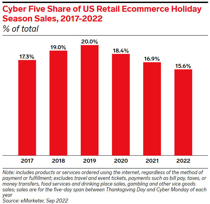 Впрочем, на кибернеделю приходится всего 15,6% розничных продаж электронной коммерции в этом году по сравнению с 16,9% в прошлом году. Так что спад всё-таки есть.