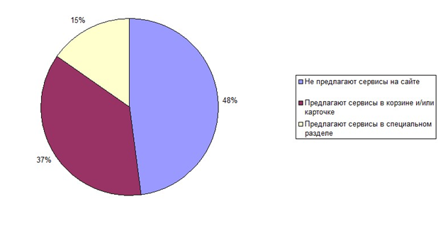 Всего было выбрано 47 площадок. Из них 22 (48%) магазина не предлагают своим клиентам никаких дополнительных услуг на своём сайте, а 7 (15%) используют для этого специальный раздел.