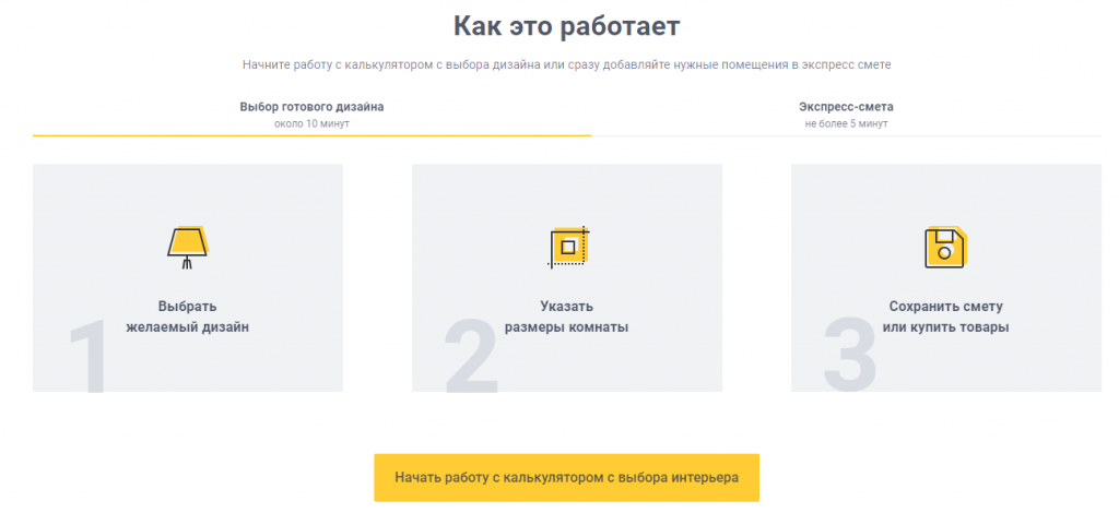 Для того, чтобы воспользоваться инструментом, надо выбрать желаемый дизайн из библиотеки сайта и указать размер комнаты, введя значения ее длины, ширины и высоты.
