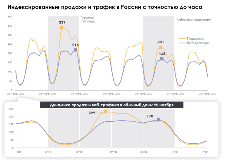 - В Черную пятницу покупатели в России в основном совершают покупки в полдень и днем, в то время как в большинстве других стран пик продаж приходится на вечер.
