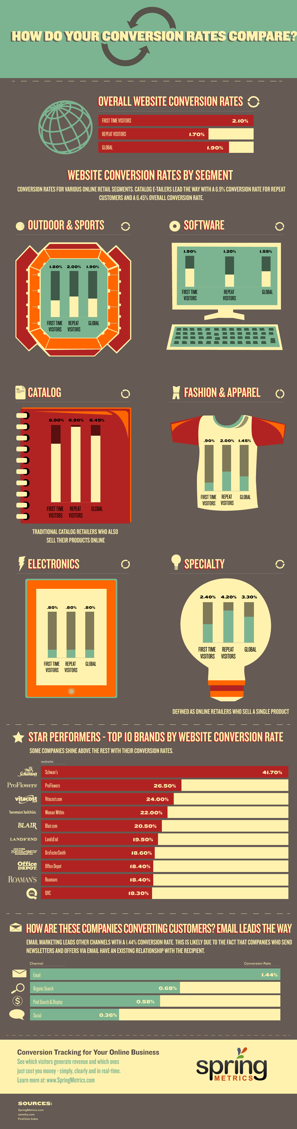 Вы задавались вопросом "какой процент конверсии должен быть в вашем интернет-магазине"? Если да, то данный график наглядно отразит соотношение заказов в указанных сферах торговли. Хоть информация и ориентирована на запад, можно провести сравнение и проанализировать с российским рынком.