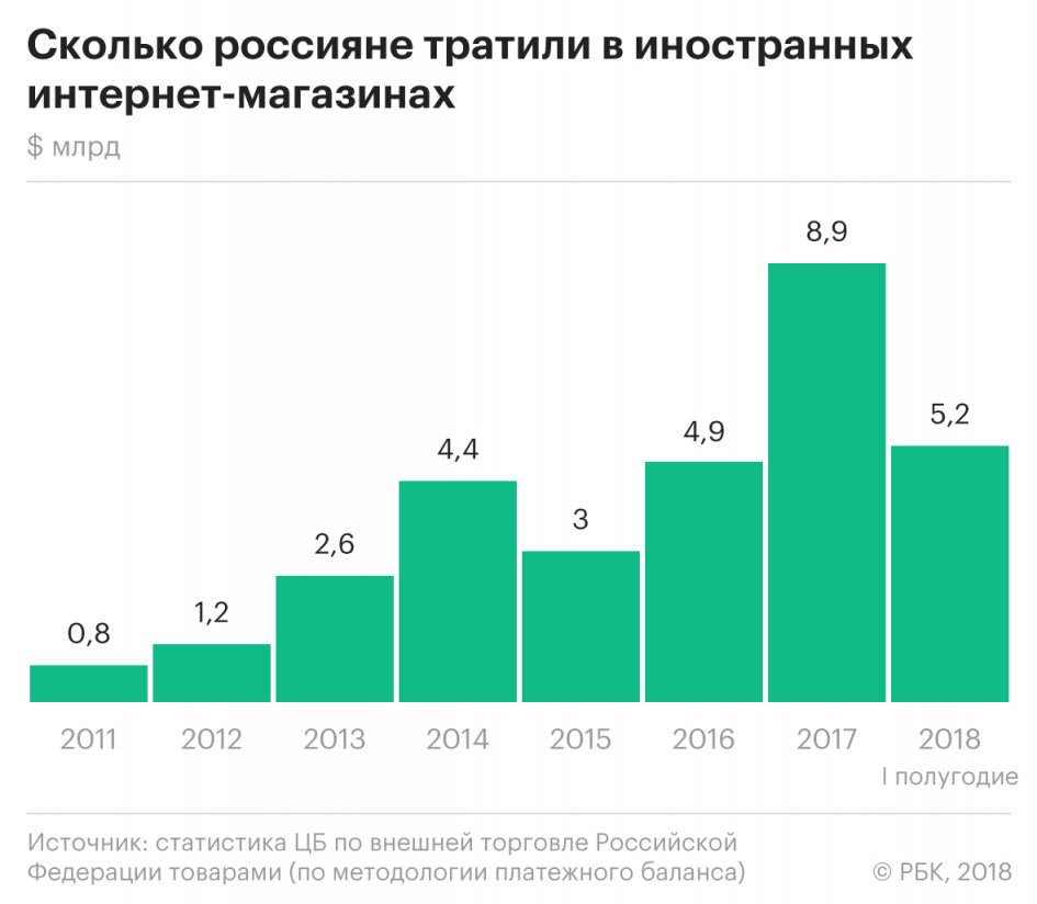 За первые шесть месяцев 2018 года россияне потратили на покупки товаров в зарубежных интернет-магазинах $5,19 млрд. Об этом говорится в статистике Банка России. По сравнению с аналогичным периодом прошлого года, объем средств, потраченных жителями России в иностранных интернет-магазинах, увеличился на 24%. При этом рост объема покупок продолжился даже не взирая на колебания курса валют после введения американских санкций.