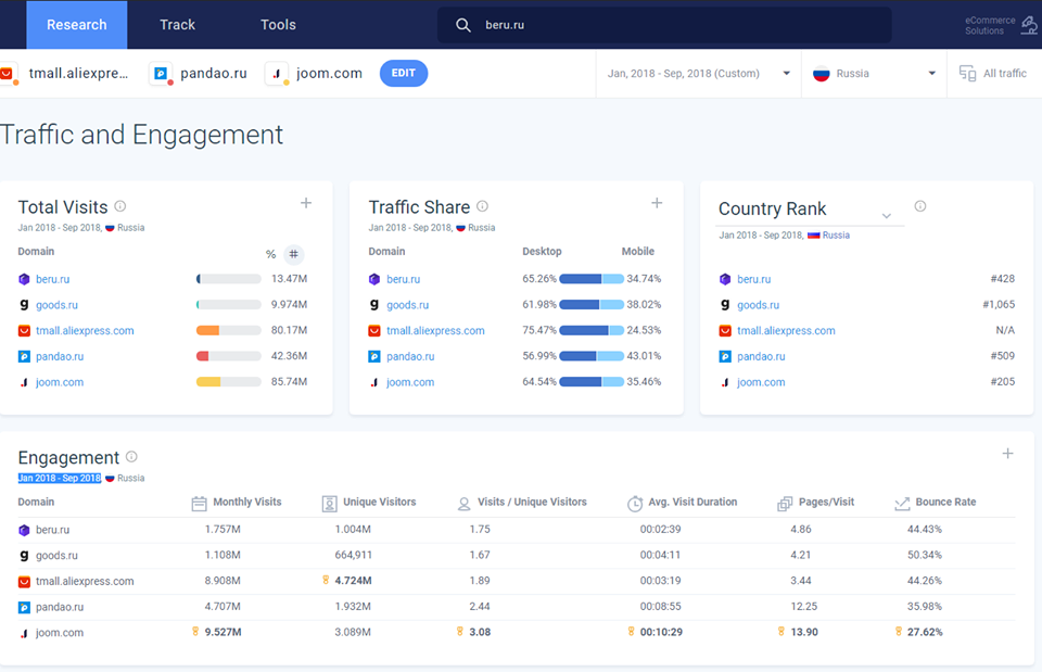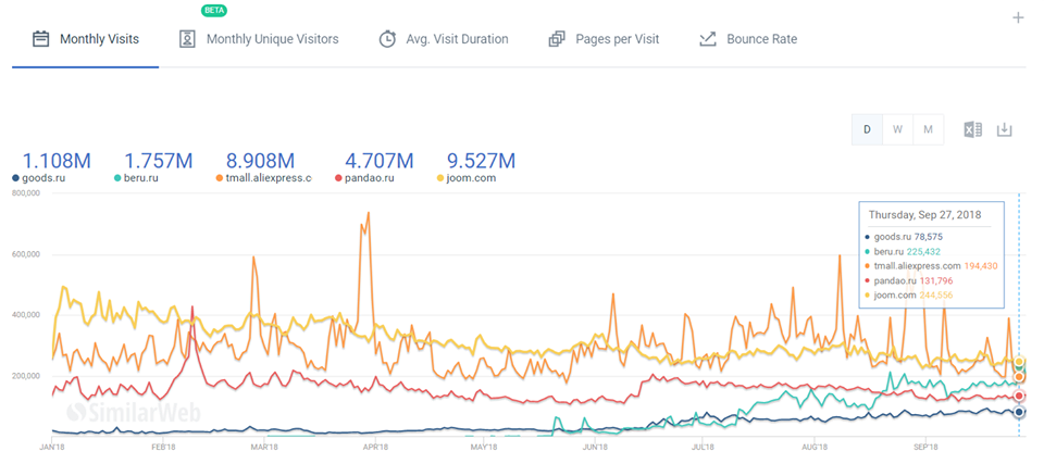 Аналитик сравнивал показатели таких площадок, как Goods.ru, "Беру", Tmall, Pandao и Joom.