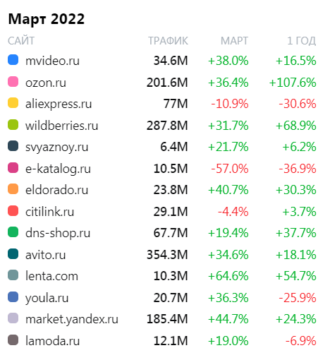 Как следует из результатов, представленных eCommerce-экспертом Алексеем Петровским (данные metrica.guru), лидером роста (год-к-году), как и месяц назад, является маркетплейс Ozon: в марте 2022 года площадку посетили почти больше 201 миллиона человек. Для сравнения: в феврале трафик был всего 148 миллионов человек. Рост за год составил 107,6%.