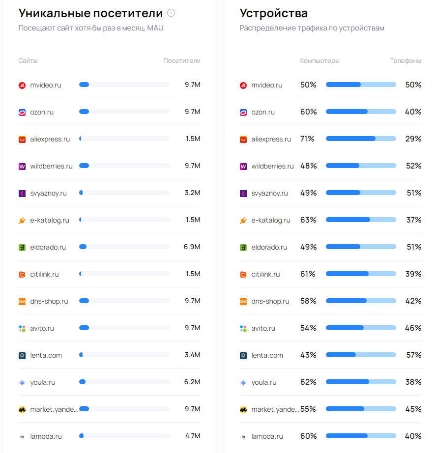 Впрочем, стоит уточнить, что данные metrica.guru не указывают заходы через приложения. А у крупнейших маркетплейсов именно на приложение приходится существенная доля заходов.