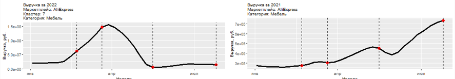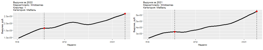 На Ozon за неделю с 21 по 27 февраля недельная выручка по категории "Мебель" составляла 706,2 млн рублей, в марте она упала на 5% и составила 670,6 млн, а к 31 июля объём недельной выручки значительно увеличился и стал равен 1,3 млрд рублей. Общий прирост выручки за полгода в итоге составил 87%