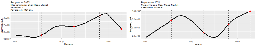 На СберМегаМаркет недельная выручка с продаж по категории "Мебель" с 21 февраля по 27 февраля составила 547,7 млн р., затем последовало несколько небольших повышений до 833 млн, однако уже к концу июля было зафиксировано падение до 640,6 млн р. Итого выручка в этой категории за весь период исследования увеличилась на 17%.