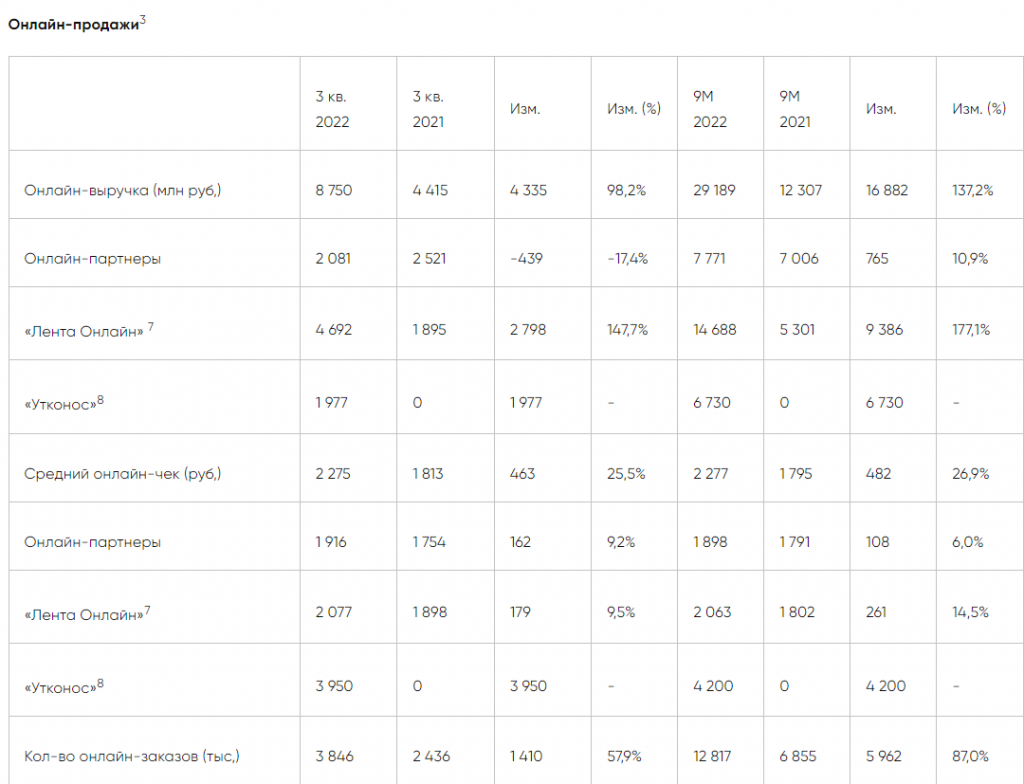Онлайн-продажи "Ленты" (включая продажи "Утконоса") выросли по итогам 3 квартала 2022 года на 98,2% год к году и составили 8,8 млрд рублей. При этом общий объем онлайн-заказов вырос на 57,9% и составил 3,8 млн заказов. Средний чек "Лента Онлайн" составил 2 077 руб. и вырос на 9,5% год к году. По итогам 9 месяцев рост (год-к-году) составил 137%.