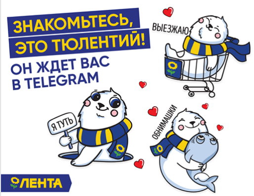 Кроме этого, "Лента" подготовала собственный пакет стикеров для Telegram. Их главный герой – тюлень Тюлентий, одетый в фирменные цвета ритейлера.