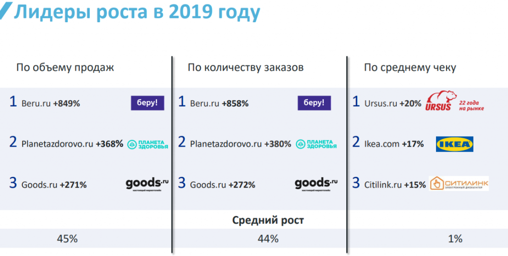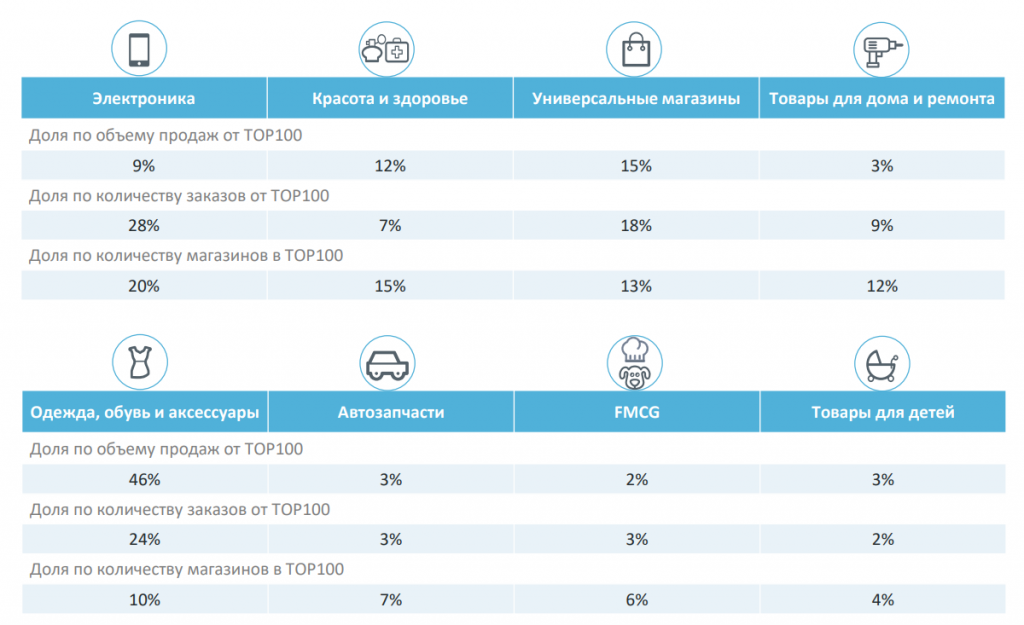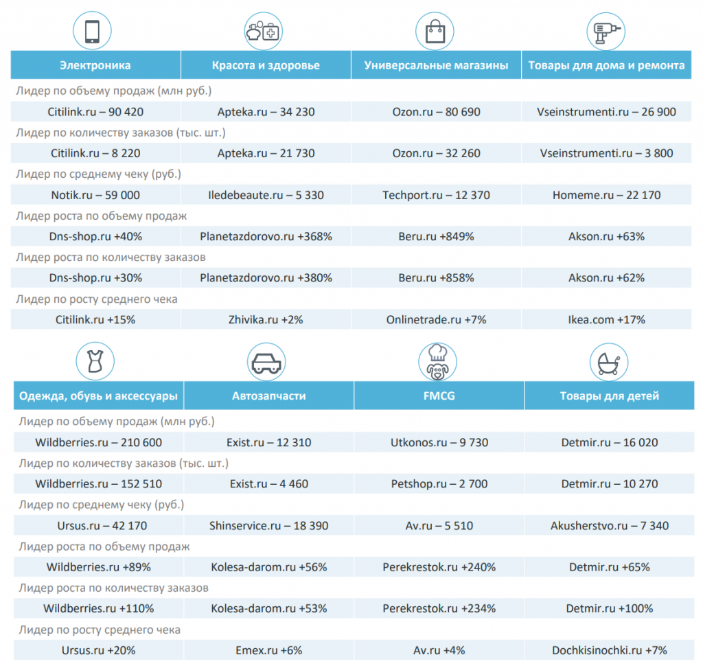 Учитывались такие показатели, как объем продаж, число заказов, средний чек, рост объёма продаж, рост числа заказов, рост среднего чека, доля разных категорий во всей структуре рынка.