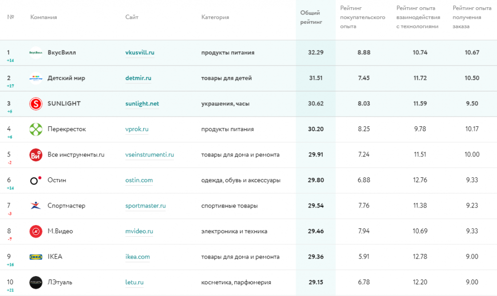Этот рейтинг включает быстроту доставки и своевременность, разнообразие ее способов, величину предлагаемых интервалов, качество полученного товара, присутствие трекинга заказа. Хорошая доставка - это показатель слаженной работы бизнес-процессов, продуманная ИТ-архитектура, коммуникация на всех этапах транспортировки товаров, способность быстро идентифицировать пользователя в случае его обращения по разным вопросам.