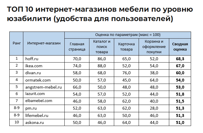 Это второй рейтинг удобства мебельных интернет-магазинов. В апреле 2020 года в пятерку лидеров вошли hoff.ru, askona.ru, lifemebel.ru, ormatek.com и stolplit.ru.
