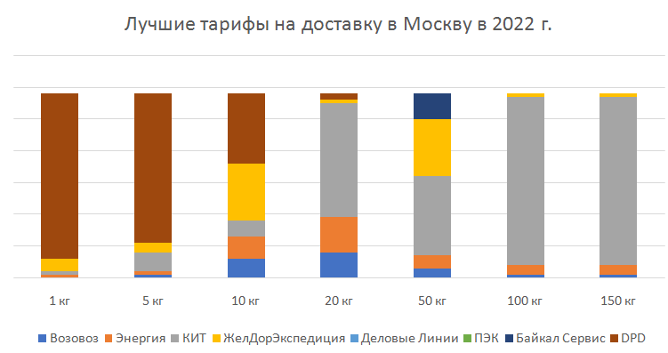 Для определения транспортной компании, предлагающей самые доступные тарифы, были проведены сравнения стоимости доставки грузов весом 1, 5, 20, 50, 100, 150 кг по 3300 внутрироссийских направлений междугородней доставки.