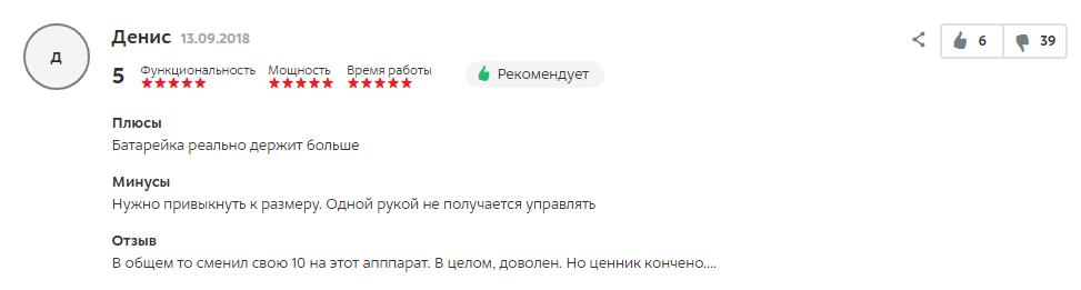Но это далеко не единственный подобный отзыв на странице. Пользователь Денис 13 сентября сообщил, что ему неудобно держать аппарат одной рукой. Тем не менее, он рекомендует этот аппарат.